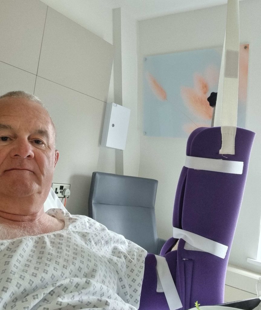 The next thing I knew it as about 3 hours later and I was back in my bed, hungry and thirsty. At this stage there was no pain, the arm was elevated to reduce the pressure on the wound. The only trouble was it was hooked on to a stand that I couldn’t reach. Had to call for help to get unhitched so I could go to the toilet. Almost immediately was given a sandwich and a cup of tea. A couple of hours later after a visit from the surgeon and filling in discharge forms I was allowed to go home. The surgeon declared himself very satisfied with the operation although it got a bit complicated as the nerve into my little finger was twisted around the collagen fibres. Painkillers were provided along with instructions about keeping my arm elevated as much as possible for a while